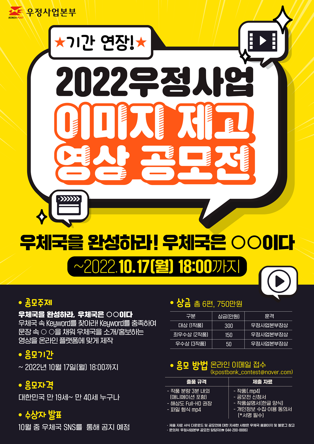 - 결과발표 : 2022. 10. 24.(월) 예정 *우정사업본부 SNS(블로그, 페이스북, 인스타그램) 및 수상(팀) 대표 개별 통보