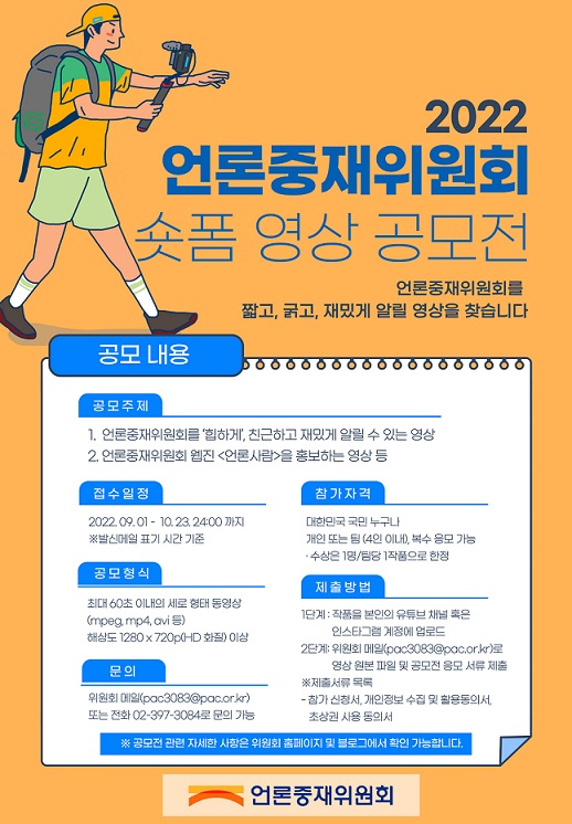 언론중재위원회는 위원회 및 대외홍보지 웹진 <언론사람>에 대한 2030세대의 인지도 향상을 위해 2022년 언론중재위원회 숏폼 영상 공모전을 개최합니다.