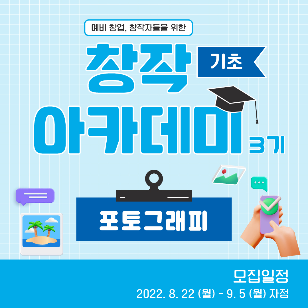 - 모집대상: 포토그래피 분야에 관심있고 사진을 촬영하고 멋지게 보정해보고 싶은 예비 창업/창직자 20명