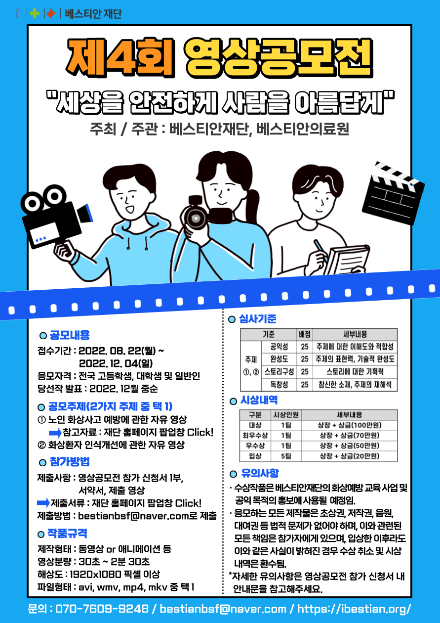 '세상을 안전하게, 사람을 아름답게' 영상 공전은 화상에 대한 부정적 인식개선과 화상 예방 교육 등 화상에 대한 국민적 이해와 관심을 높여 화상으로부터 안전한 세상을 만들기 위해 (재)베스티안재단이 진행하는 공익적 성격을 지닌 공모전 입니다. 본 공모전을 통해 우리 주변의 소외되고 어두운 부분을 밝고 아름답게 개선하고자 하는 변화의 시작이 되길 희망합니다.