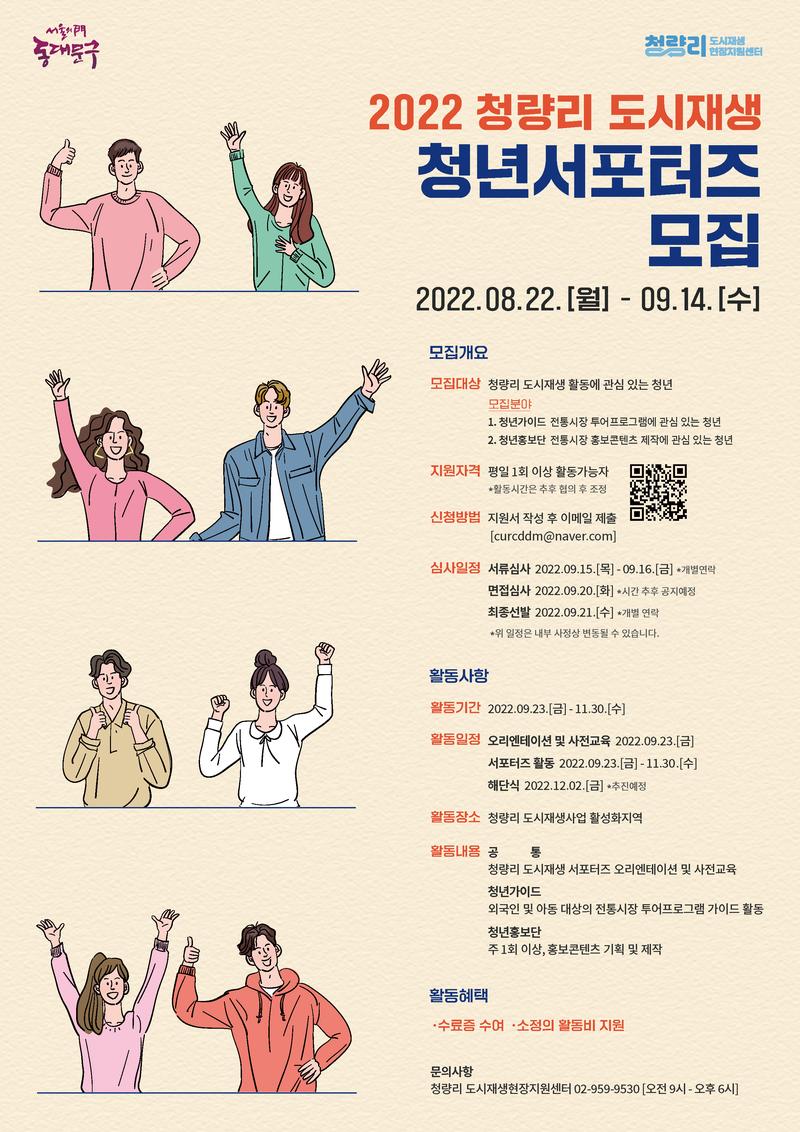 - 청량리 도시재생현장지원센터는 청량리종합시장 일대 다양한 전통시장 활성화를 위해 지역주민에게 시장별 스토리를 안내하고, 홍보콘텐츠 기획 및 제작에 참여할 청량리 도시재생 청년서포터즈를 모집합니다.