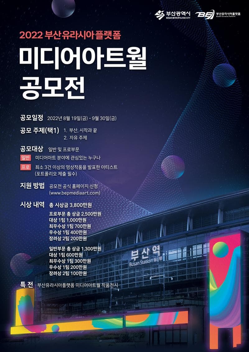 - 4차 산업혁명시대의 문화예술에 혁신을 더한 융복합 미디어아트 창작 프로젝트를 통해 창의적인 국내 신진작가 발굴은 물론 시민들에게 예술적 영감과 시각적 즐거움을 주고자 “2022부산유라시아플랫폼 미디어아트월 공모전”을 개최합니다.