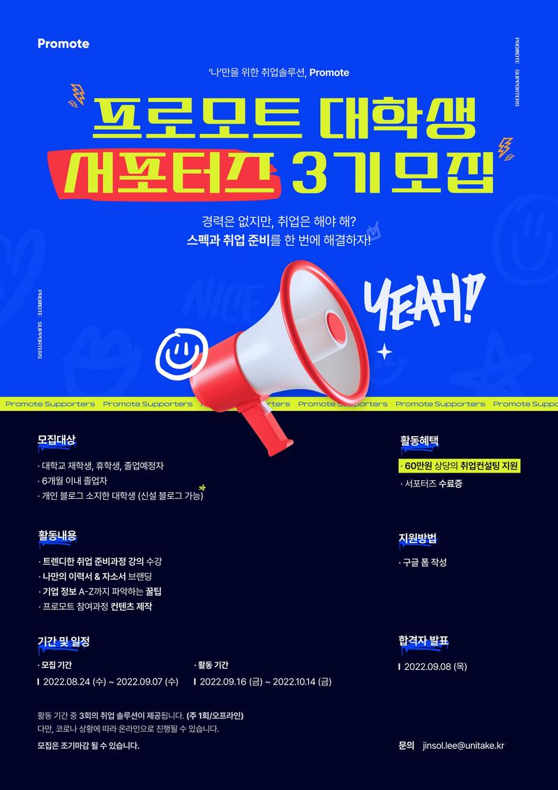 저희는 "누구나 좋아하는 일을 찾아 좋은 기업에 취업할 수 있도록," 맞춤형 취업 솔루션, 프로모트를 만들어가고 있습니다. 프로모트와 함께 스펙과 취업준비를 한번에 잡을 서포터즈 3기를 모집합니다!