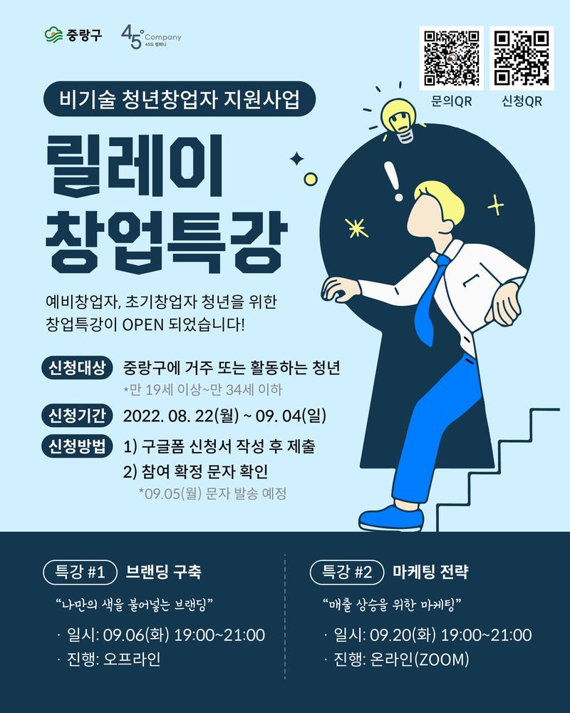 "창업"을 시작한, "창업"에 관심이 있는 중랑구 청년 여러분을 위한 창업 특강이 OPEN 되었습니다!