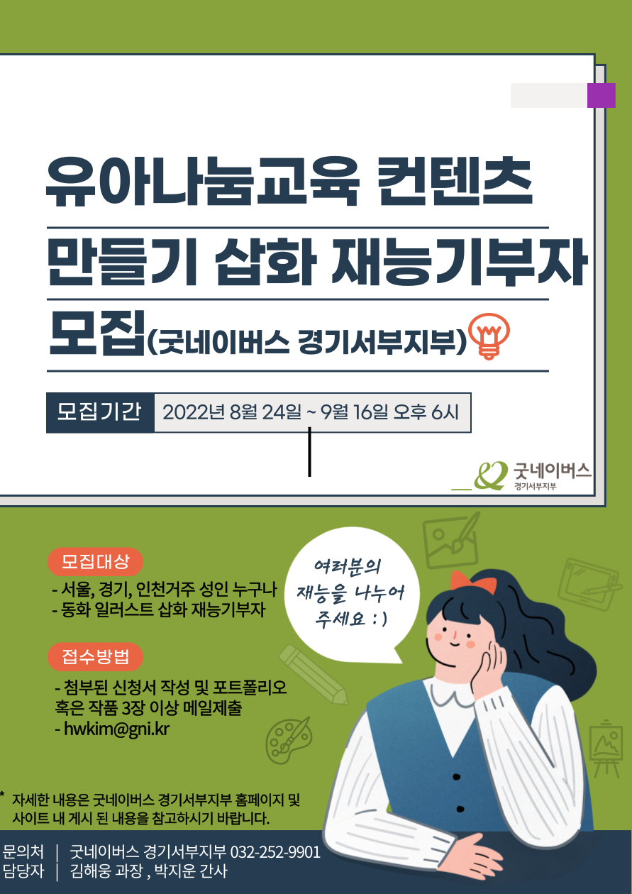 굿네이버스 경기서부지부에서 유아나눔교육컨텐츠제작 삽화 재능기부를 해주실 일러스트레이터 작가님을 모집합니다