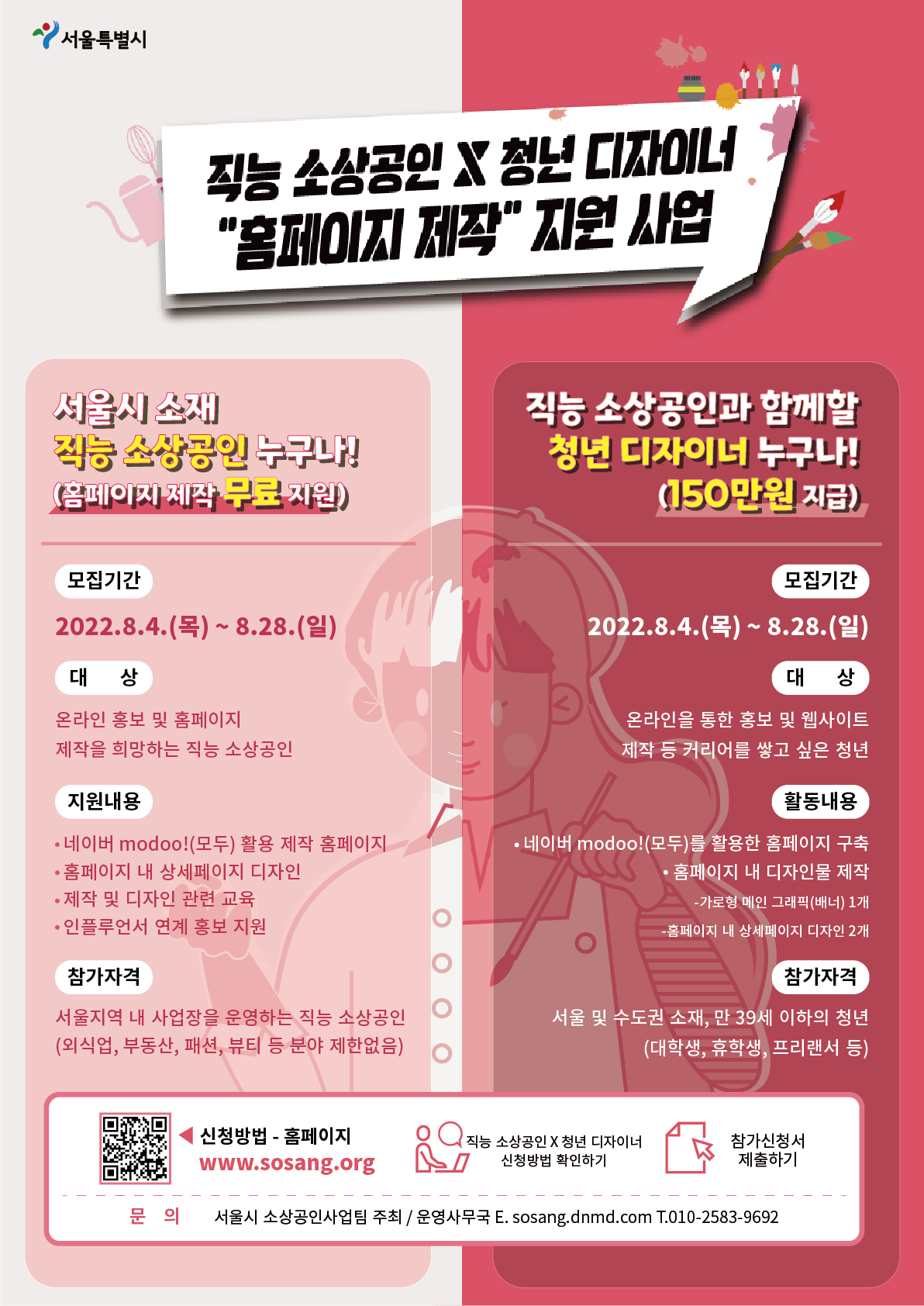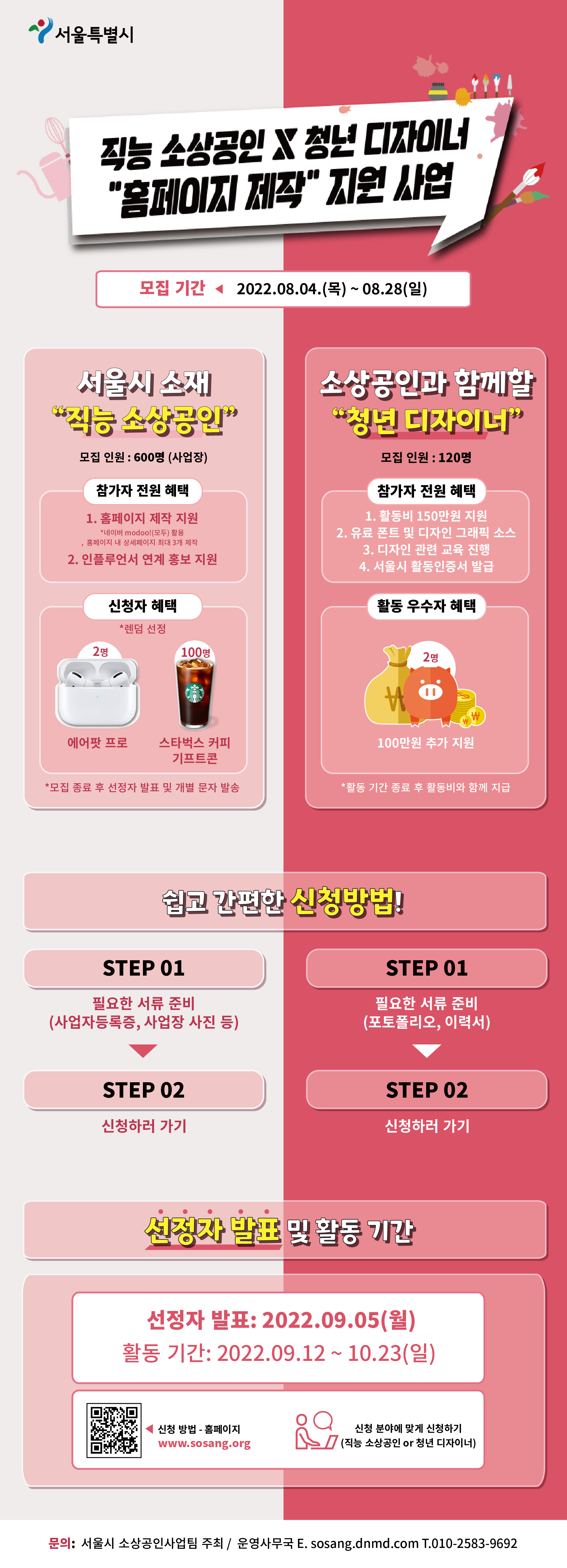 이번 지원 사업을 통해서 운영에 어려움을 겪고 있는 직능 소상공인에게 보탬이 될 수 있도록, 그리고 청년 디자이너들의 비즈니스 및 디자인 역량 향상을 도모할 수 있도록 많은 참여 바랍니다.