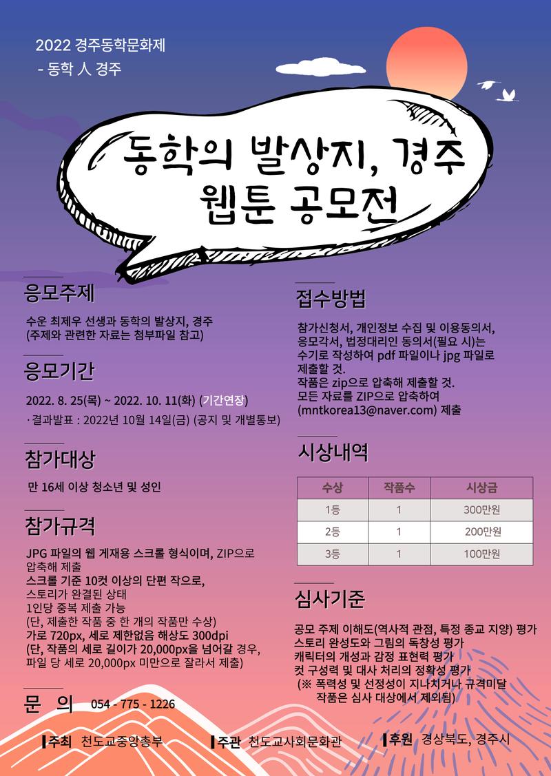 1. 공 모 명 : 경주 동학 문화제 웹툰 공모전 2. 공모주제 : 동학의 발상지이자 수운 최제우 선생의 본관인 경주시 ※ 주제에 관련한 자료는 첨부파일 참고 3. 응모기간 : 2022년 8월 25일(목) \~ 2022년 10월 4일(화) (44일간) * \~ 2022년 10월 11일(화) (기간연장) 4. 응모자격 : 만 16세 이상 청소년 및 성인 5. 작 품 수 : 1인당 중복제출 가능 (단 제출한 작품 중 한 개의 작품만 수상) 6. 작품규격 〇 jpg 파일의 웹 게재용 스크롤 형식이며, Zip으로 압축해 제출 〇 스크롤 기준 10컷 이상의 단편 작으로 스토리가 완결된 상태 〇 가로 720px, 세로 제한 없음(단, 작품의 세로 길이가 20,000px을 넘어갈 경우, 파일 당 세로 20,000px 미만으로 잘라서 제출), 해상도 300dpi 7. 응모방법 〇 공고에서 신청서 다운로드 후 전자우편 (mntkorea13@naver.com) 제출 〇 참가신청서, 개인정보 수집 및 이용동의서, 응모각서, 법정대리인 동의서(필요시)는 수기로 작성하여 pdf파일이나 jpg파일로 제출 〇 작품은 jpg 파일을 Zip으로 압축해 제출 ※ 전자우편 제출 후 유선확인 (☎054-775-1226/ 업무시간 내 전화) 8. 제출서류 : 참가 신청서, 개인정보 수집 및 이용 동의서, 응모 각서, 작품 파일