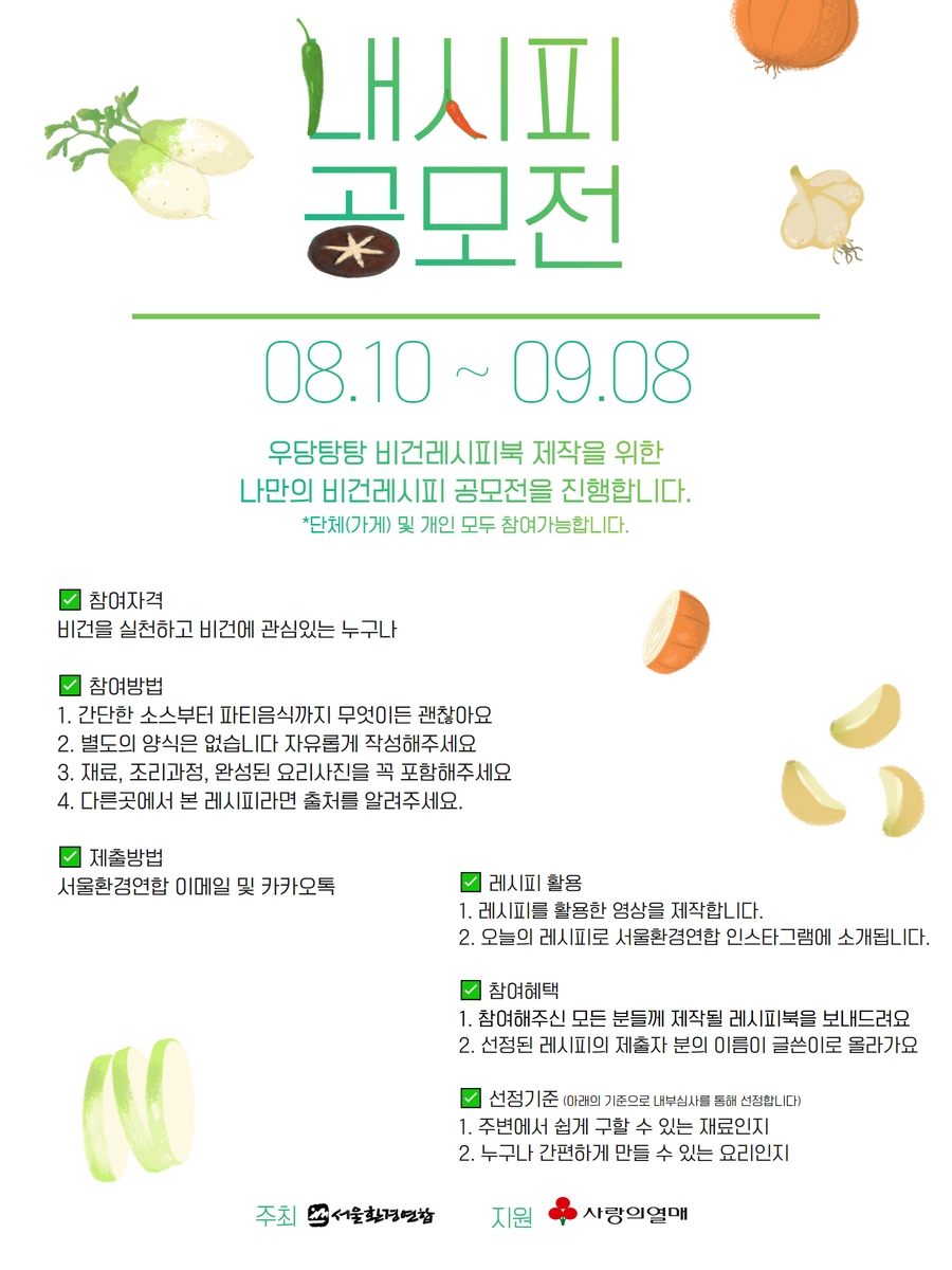 '비건 내시피 공모전' 이름은 거창하지만 비건을 실천 중이라면 누구나 함께 할 수 있어요~.😊 도전해보세요!
