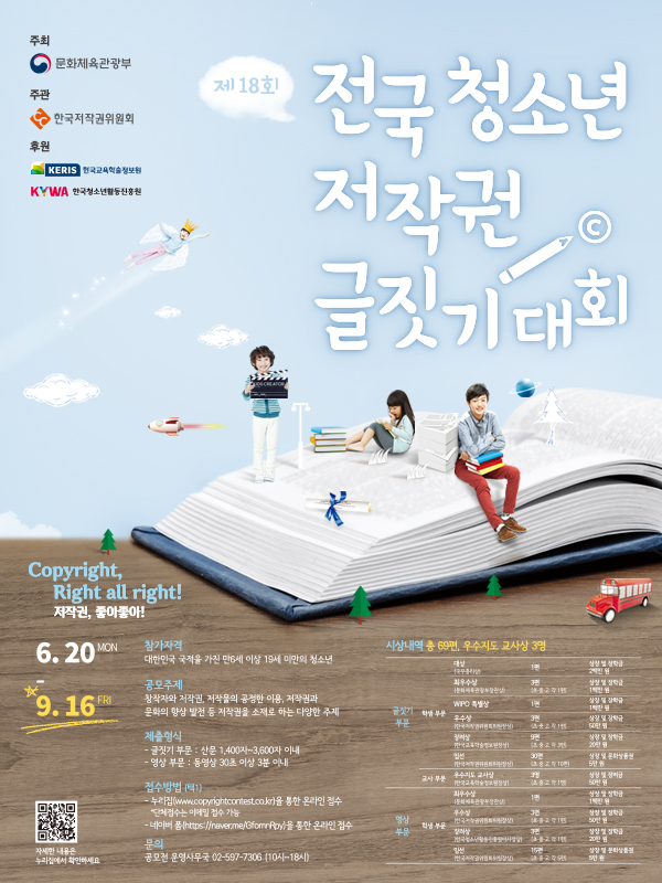 저작권에 대한 의식을 제고하고자 “제18회 전국 청소년 저작권 글짓기 대회”를 개최합니다.
