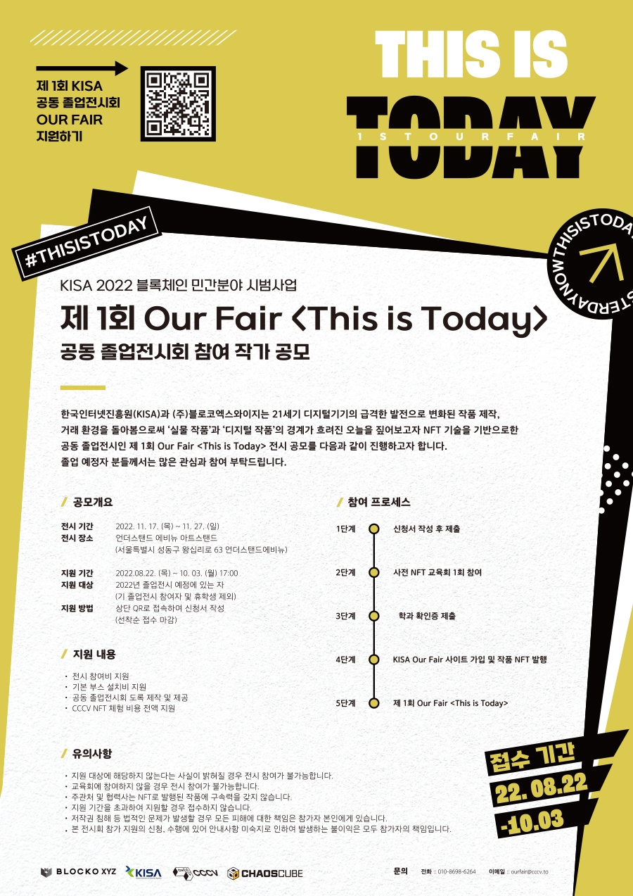 [지원 내용] - 전시 참여비 지원 - 기본 부스 설치비 지원 - 공동 졸업전시회 도록 제작 및 제공 - CCCV NFT 체험비용 전액 지원 [참여 프로세스] 1단계 : 신청서 작성 후 제출 2단계 : 사전 NFT 교육회 참여 (1회 / 약 1시간 30분 가량 소요) 3단계 : 학과 확인증 제출 (양식 교육회에서 제공 예정) 4단계 : KISA Our Fair 사이트 가입 및 작품 NFT 발행 5단계 : 전시 개인 부스 조성 (11.16) 6단계 : 전시 개최 (11.17\~11.27) 7단계 : 전시 철거 (11.28)
