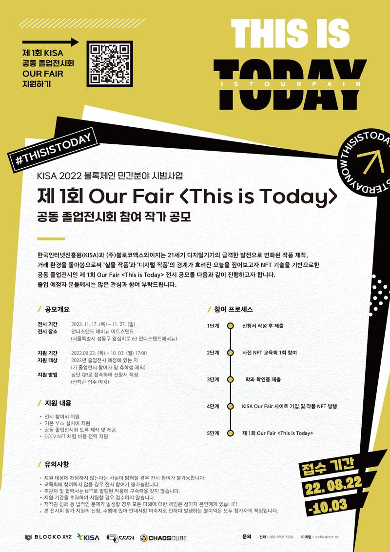 한국인터넷진흥원(KISA)과 (주)블로코엑스와이지는 21세기 디지털기기의 급격한 발전으로 변화된 작품 제작, 거래 환경을 돌아봄으로써 ‘실물 작품’과 ‘디지털 작품’의 경계가 흐려진 오늘을 짚어보고자 NFT기술을 기반으로한 공동 졸업전시인 제 1회 Our Fair \