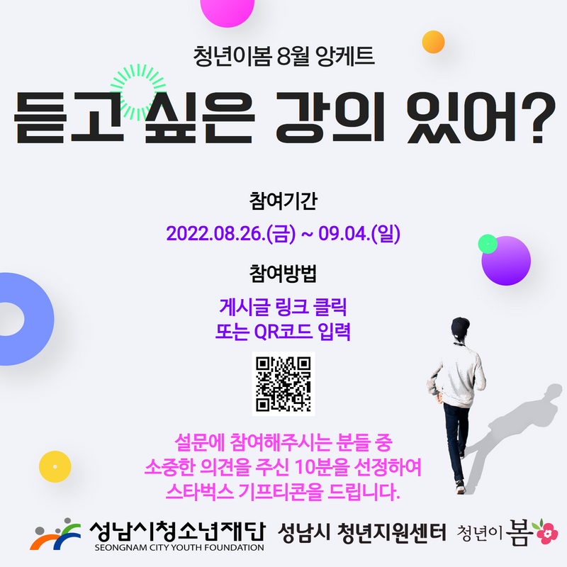 이번 앙케트 조사에서는 2022년 청년이봄 하반기 청년교양 프로그램의 강의 주제 수요 파악을 위한 설문조사를 진행하고 있습니다. 설문 결과는 성남시청년지원센터 청년이봄의 사업에 반영됩니다.
