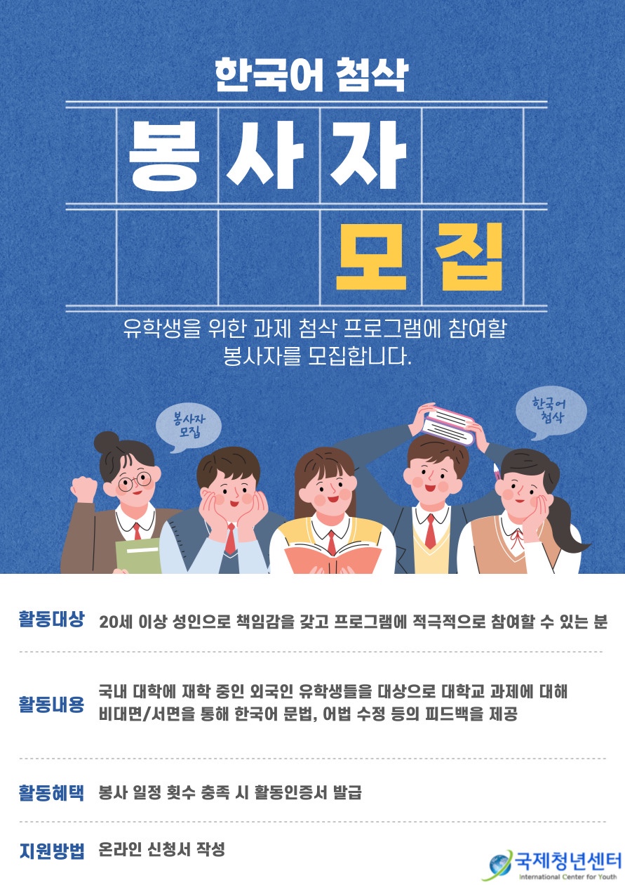< 한국어로 된 과제 첨삭을 어려워하는 외국인 유학생들에게 도움을 줄 봉사자를 모집합니다. >