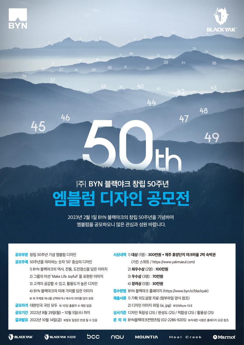 2023년 2월 1일 BYN 블랙야크의 창립 50주년을 기념하여 엠블럼을 공모하오니 많은 관심과 성원 바랍니다.