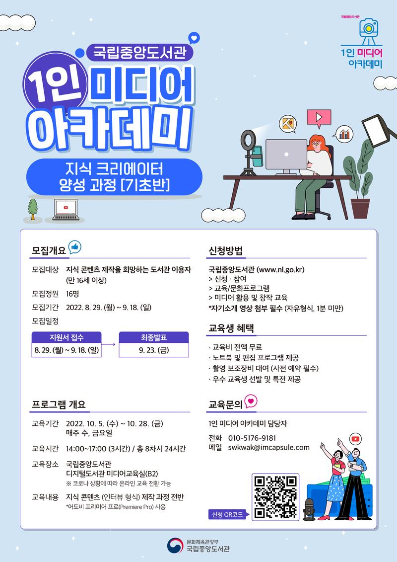국립중앙도서관에서 재능 있는 크리에이터들을 발굴하고자 '2022 1인 미디어 아카데미'를 운영합니다.