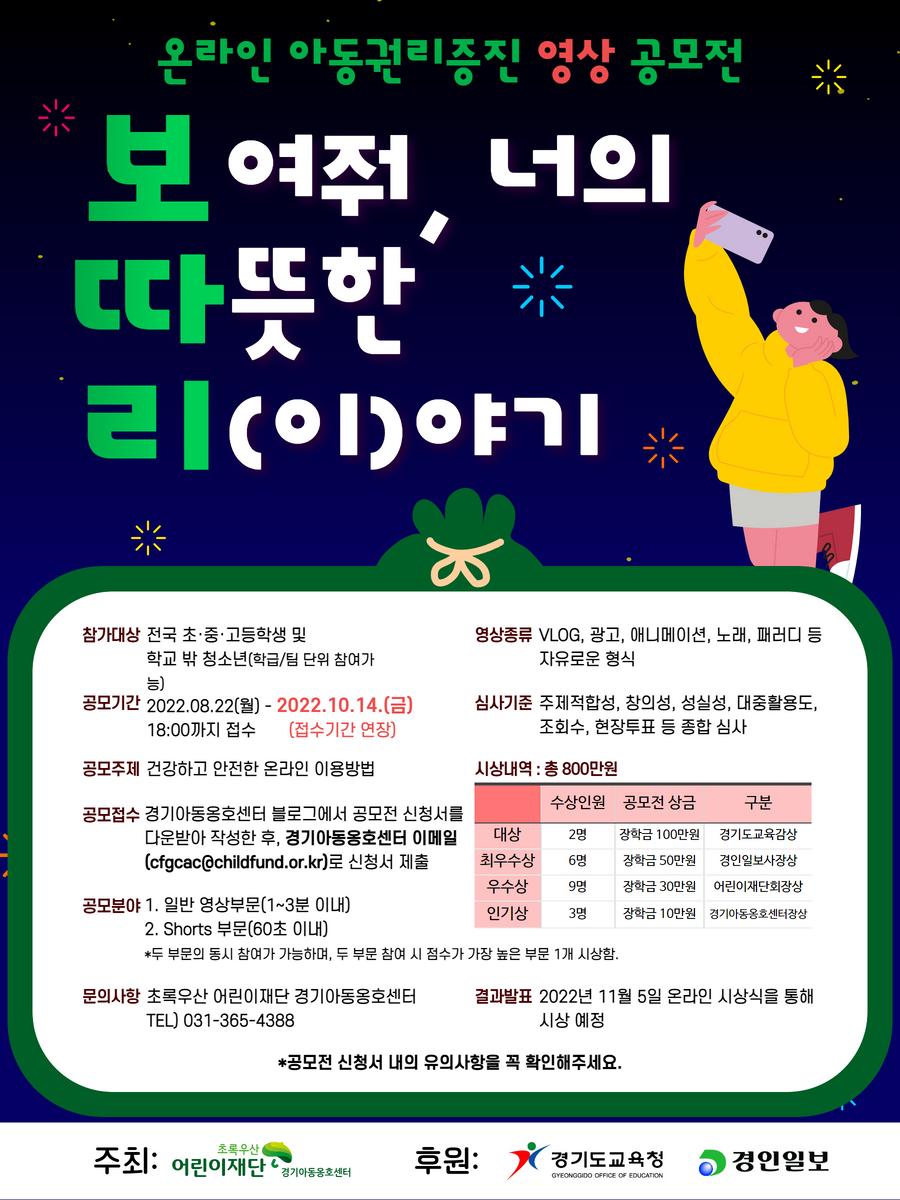 초록우산어린이재단 경기아동옹호센터에서는 아동과 청소년이 온라인 환경 내에서 권리를 보장하고 서로 존중하는 인식의 확산을 위해 온라인 아동권리증진 영상 공모전을 다음과 같이 진행합니다.