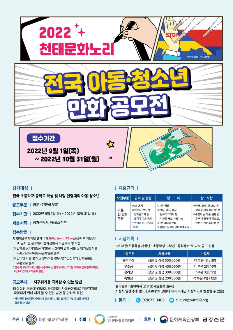 만화 그리기를 통해 아동 청소년의 자존감 향상을 위하여 ‘전국 아동·청소년 만화 공모전’을 개최합니다.