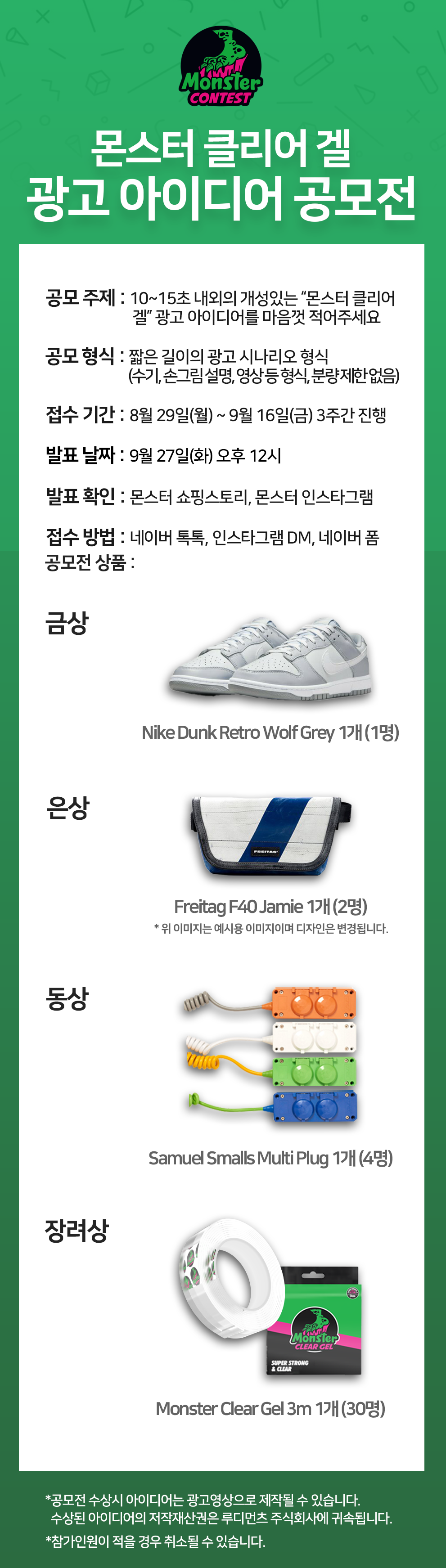 공모 주제 : 10~15초 내외의 개성 있는 "몬스터 클리어 겔"광고 아이디어를 마음껏 적어주세요.