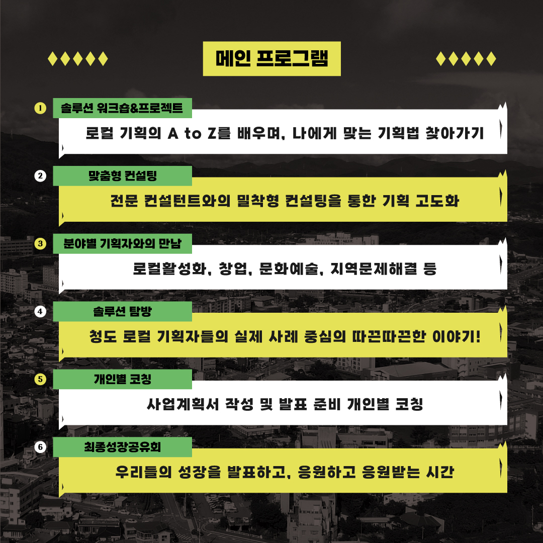 - 대구·경북 내 프로그램 기획 및 로컬크리에이터 창업 관심 청년 10명 (*청도 기준 만 19~49세)