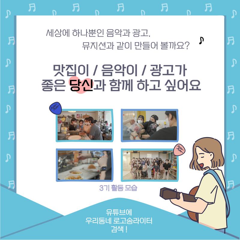 <우리동네 로고송라이터>는 뮤지션과 청년, 지역 소상공인이 만나 새로운 인연을 만들고, 음악과 광고를 만들어 지역에 활력을 불어넣는 사회적 예술 프로젝트입니다.