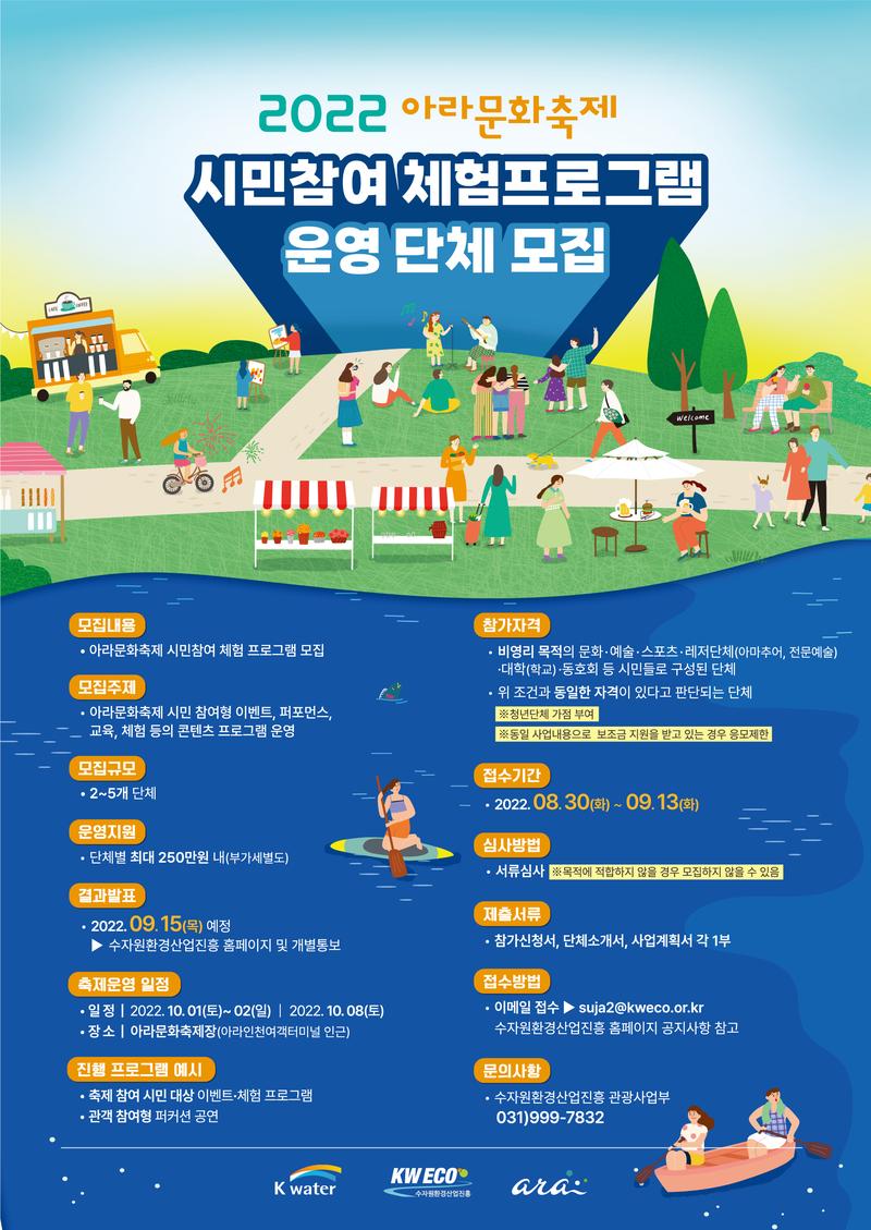 ▪모집주제 : 아라문화축제 시민 참여형 이벤트, 퍼포먼스, 교육, 체험 등의 콘텐츠 프로그램 운영