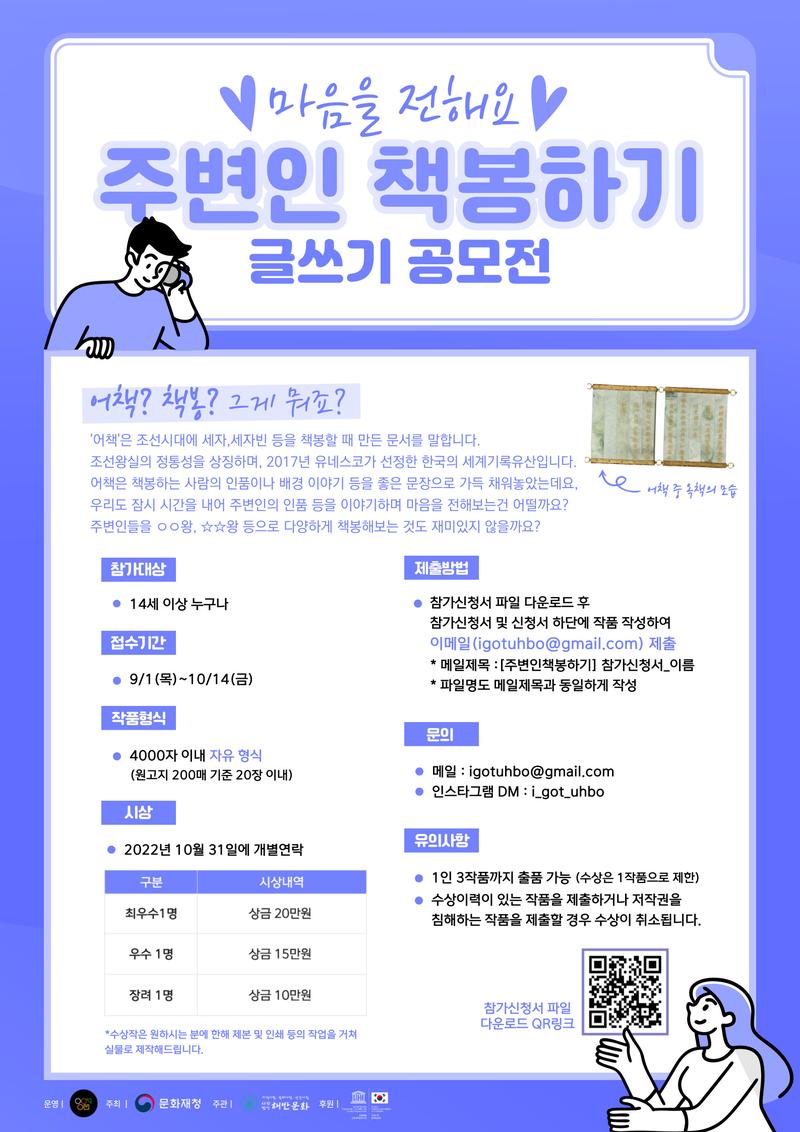 목적 및 기대효과: 조선왕실의 정통성을 상징하는 ‘어책’은 유네스코가 선정한 한국의 세계기록유산입니다. 하지만 잘 알려지지 않음 문화유산 중 하나입니다. 이렇듯 생소한 ‘어책’을 알리기 위해 시민들의 적극적인 참여를 유도할 수 있는 방법으로 글쓰기 공모전을 시행하고자 합니다.