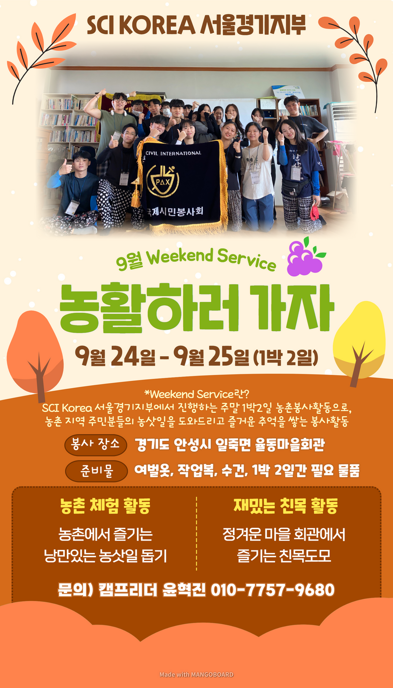 9월 Weekend Service가 예정되어 참여자를 모집하고 있습니다.