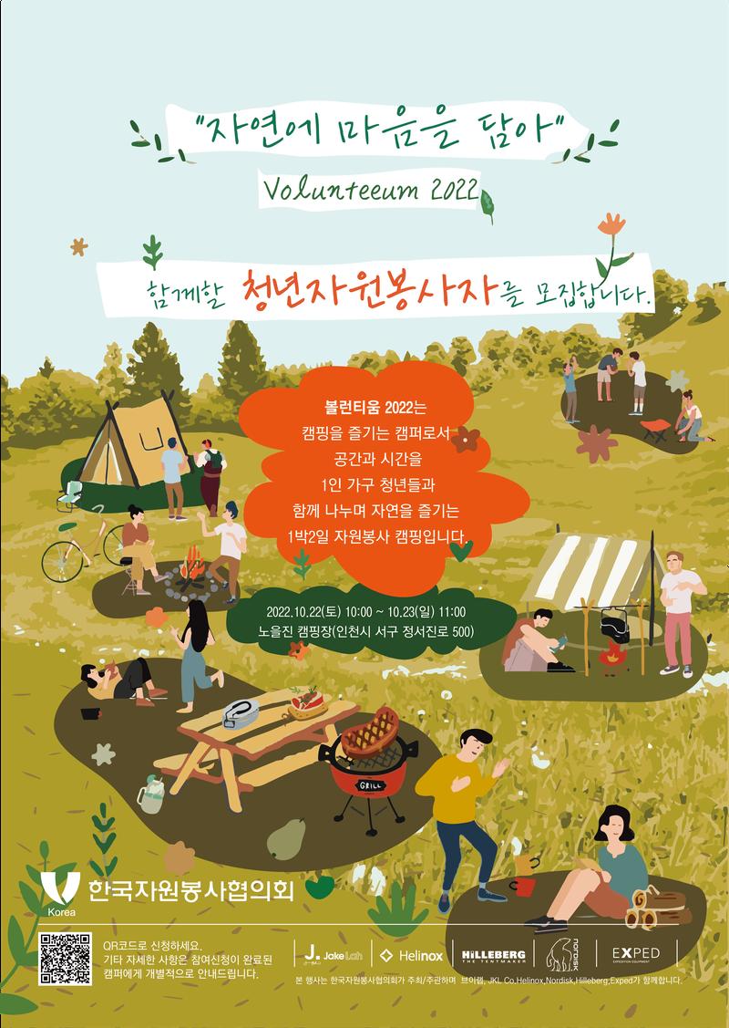 <Volunteeum 2022>는 "자연에 마음을 담아"를 슬로건으로 청년들과 마음을 나누며 자연을 함께 즐기는 자원봉사 캠핑입니다. 청년과 자원봉사자, 캠퍼를 포함해 총 200명 내외의 인원이 참석할 예정이며 대화가 줄어든 현대 사회에 1인 가구 청년들이 좋은 사람과 만나 소통의 장을 마련하고자 하는 취지를 가지고 있습니다.
