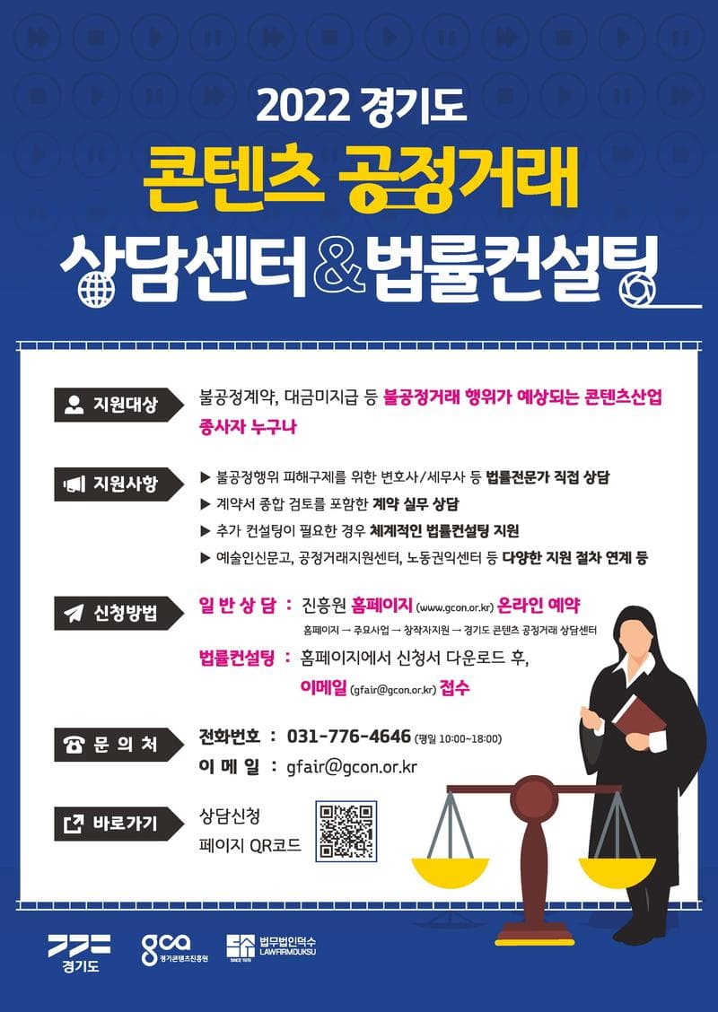 - 일반 상담 : 경기콘텐츠진흥원(https://www.gcon.or.kr/) 온라인 예약