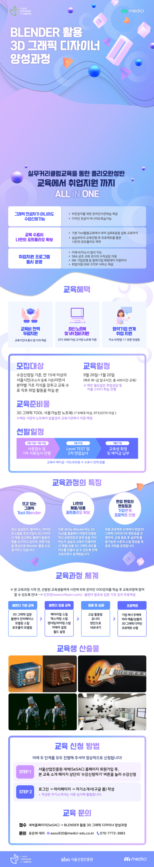 - 최근 채용 수요 급증 분야인 프로덕트 디자인 기반 3D 그래픽 디자이너 양성을 위한 커리큘럼 구성