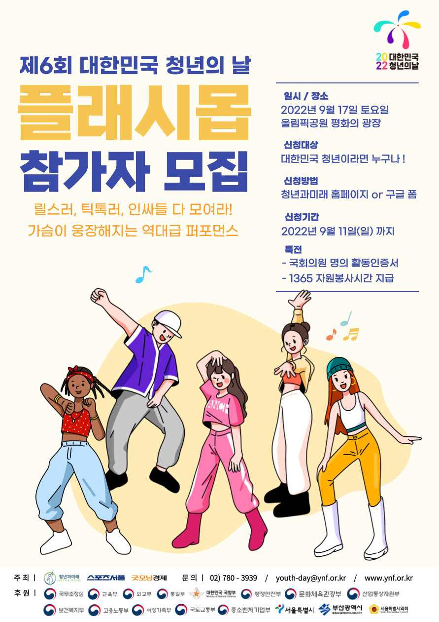 대한민국 청년들이 직접 기획하고 참여하는 참여형 종합축제✨ 이번 청년의 날 함께할 플래시몹 참가자 여러분을 모집합니다!