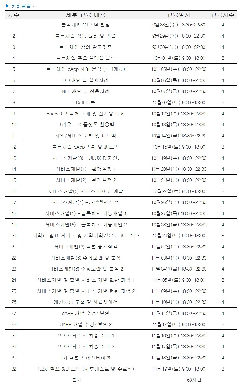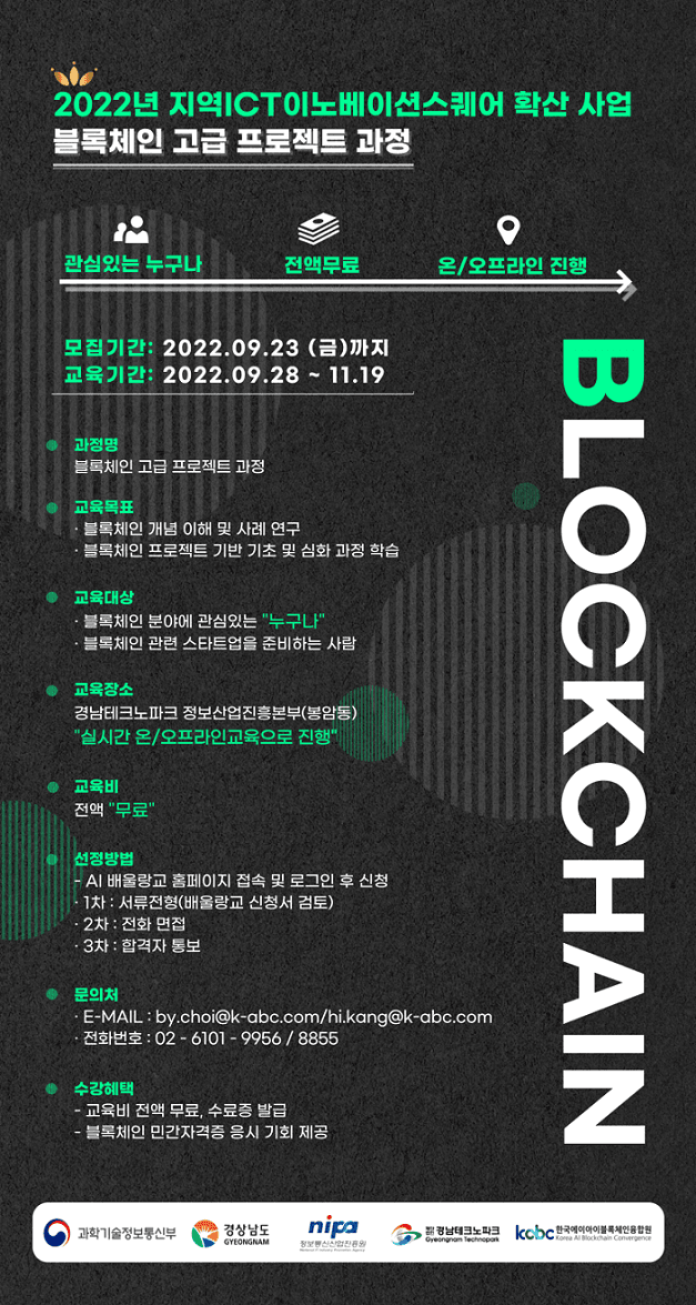 * 수강혜택: 교육비 전액 무료 , 수료증 발급, 블록체인 민간 자격증 응시 기회 제공