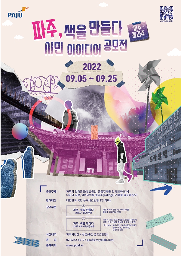 파주, 색을 만들다 [청소년 / 일반] 부문 | ▶사진, 그림 등을 베이스로 한 아이디어 콜라주 작품을 디지털 파일로 제출 ▶이미지 제출의 경우 최소 A4 이상, 200dpi 이상으로 작업 또는 스캔하여 제출 JPG/PNG/PDF 파일, 1인/1팀당 이미지 3개까지 제출 가능 ▶200자 내외 작품 설명글 ▶각 파일 크기가 20MB를 넘지 않도록 권장함 |