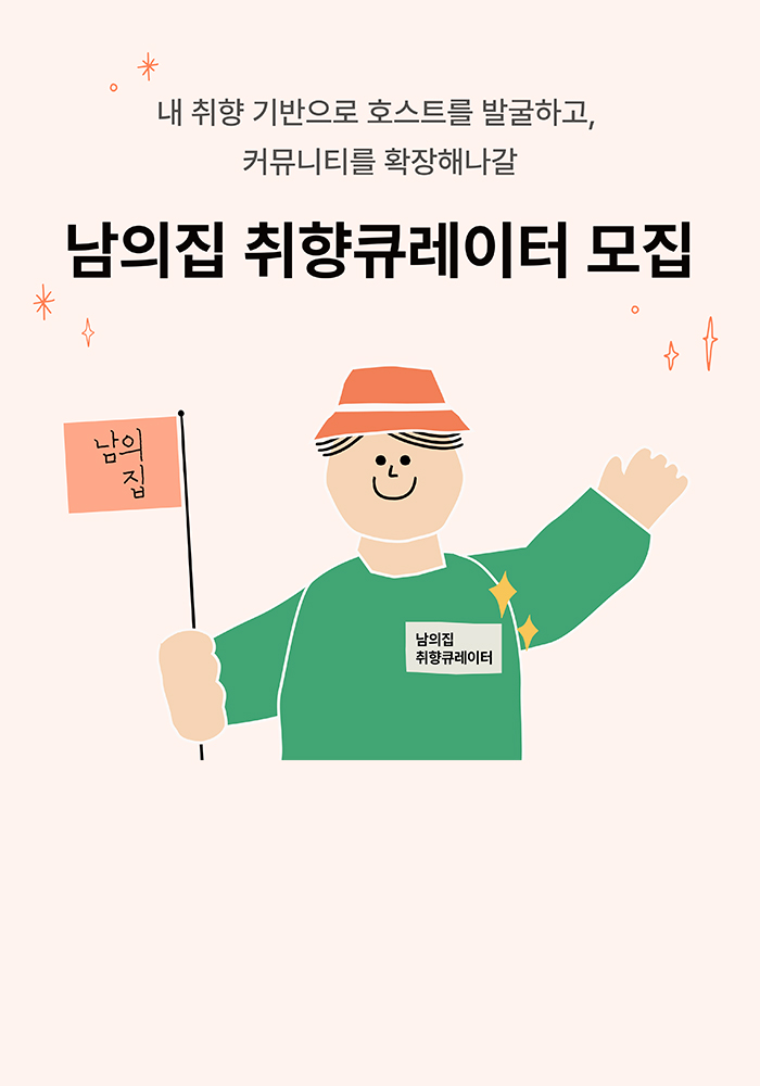 내 취향을 기반으로 호스트를 발굴하고, 커뮤니티를 널리 확장해나갈 ‘남의집 취향큐레이터’를 모집해요!
