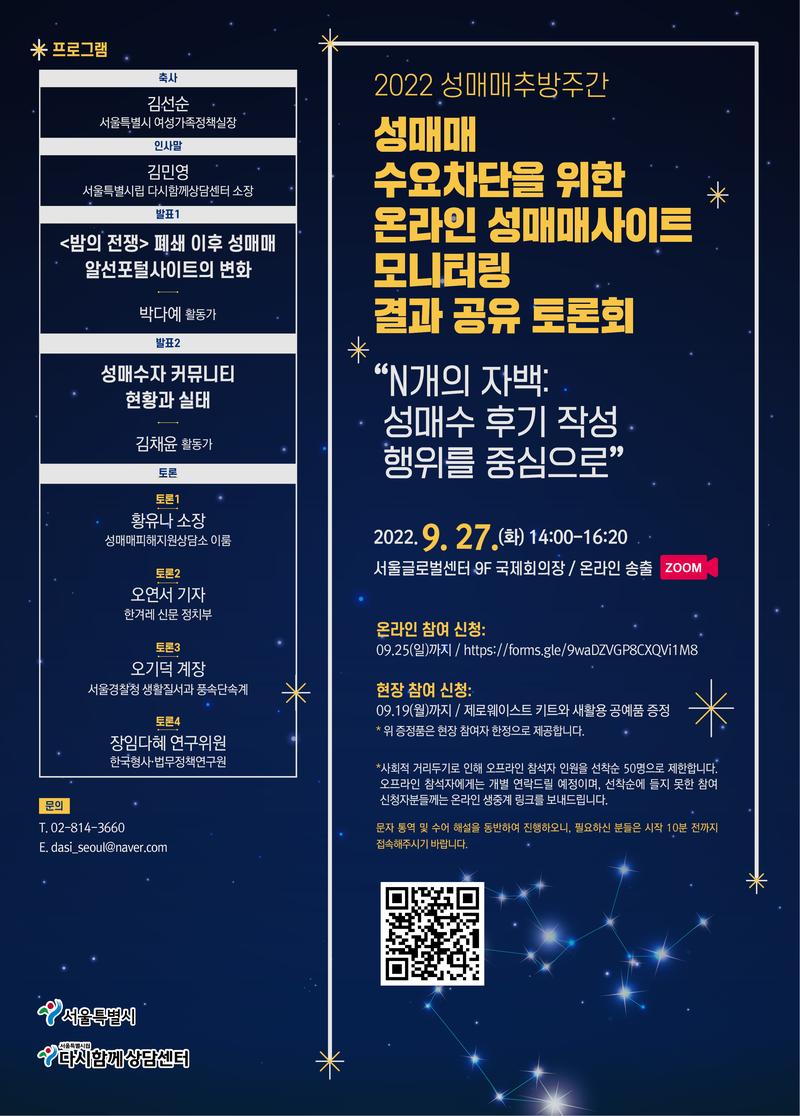 2022 성매매추방주간을 맞아 온라인 성매매 수요차단을 위해 다시함께상담센터에서 진행한 온라인 성매매 사이트 모니터링 결과 공유 토론회를 열고자 합니다.