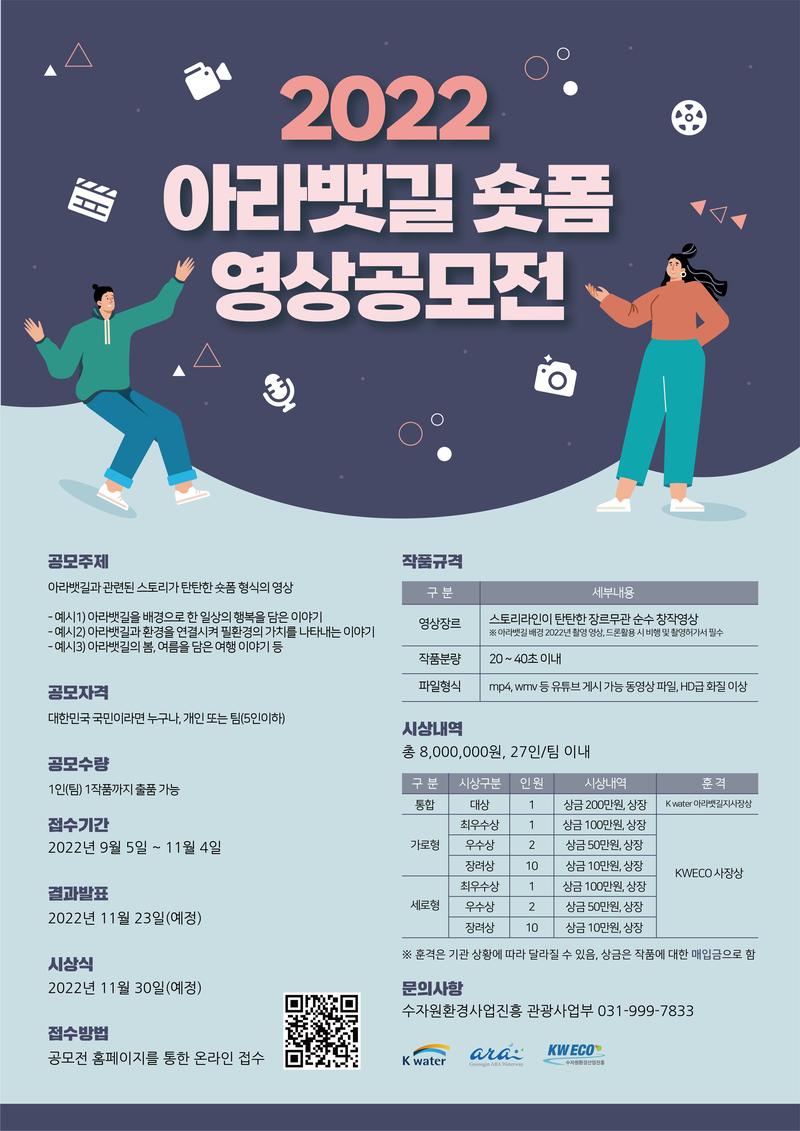 사회문화 참여 기회 확대를 위한 "2022년 아라뱃길 숏폼 영상공모전"을 진행합니다. 많은 관심과 참여 부탁드립니다.
