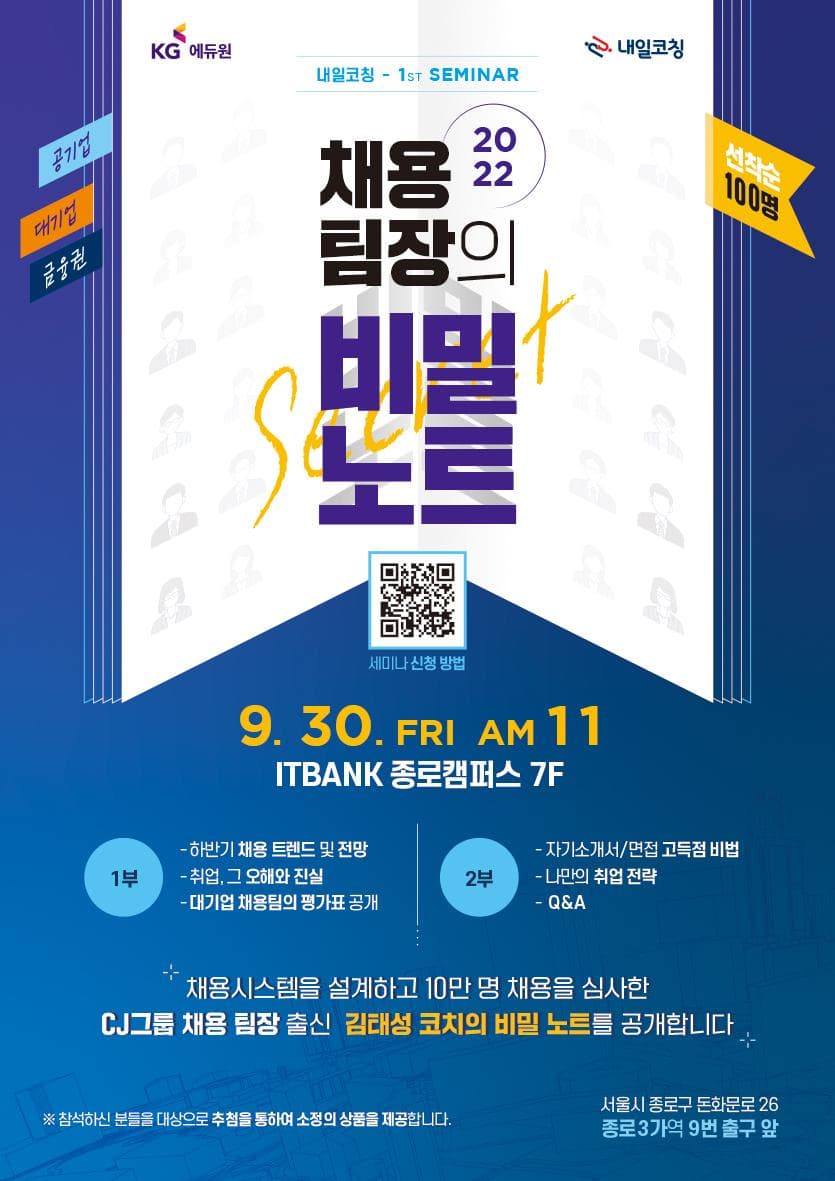 * KG그룹의 교육 계열사인 KG에듀원 내일코칭에서 2022년 하반기 채용 대비 무료 취업 세미나를 개최합니다.