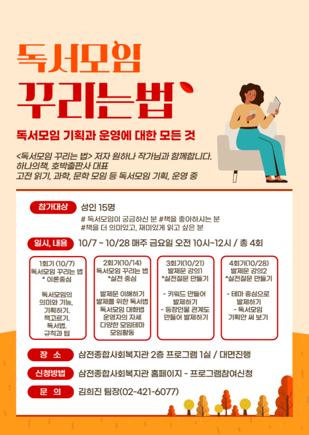 - 독서모임 꾸리는 법 > 참여자모집 | 삼전종합사회복지관 (samjeon.or.kr) 링크 클릭 후 신청