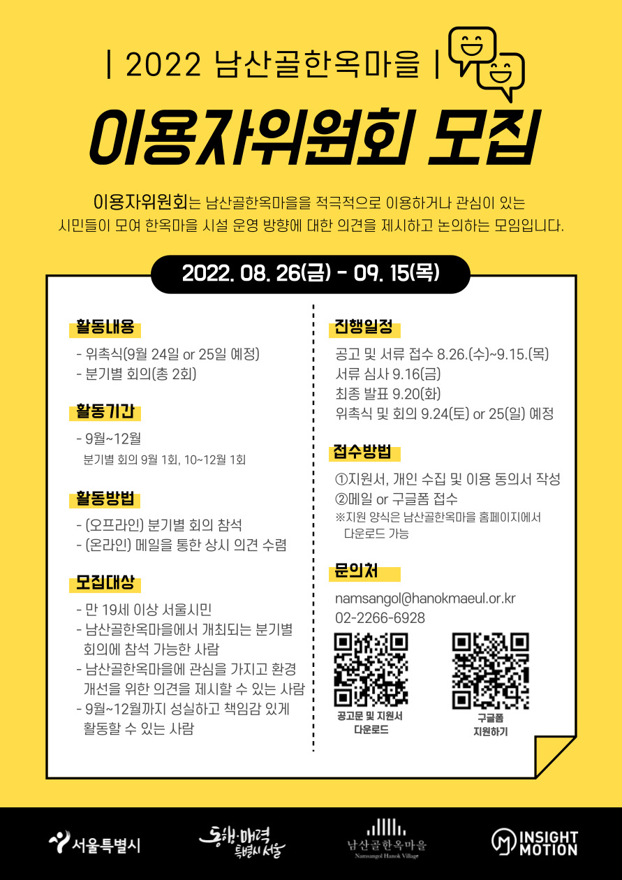 남산골한옥마을을 적극적으로 이용하거나 관심이 있는 시민들이 모여 한옥마을 시설 운영 방향에 대한 의견을 제시하고 논의하는 모임입니다.
