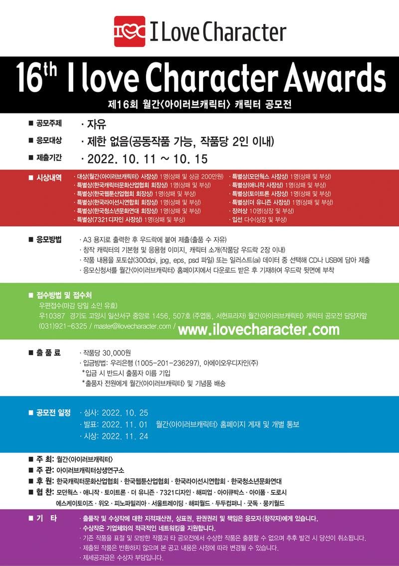 -접수 주소: (10387) 경기도 고양시 일산서구 중앙로 1456, 서현프라자 507호 월간 <아이러브캐릭터> 캐릭터 공모전 담당자앞