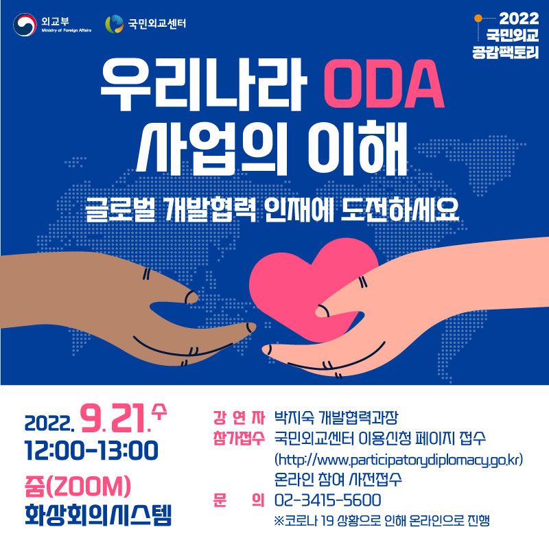 외교부는 9월 21일(수) 12:00-13:00 “우리나라 ODA 사업의 이해 - 글로벌 개발협력 인재에 도전하세요"를 주제로 국민외교 공감팩토리를 개최할 예정입니다.