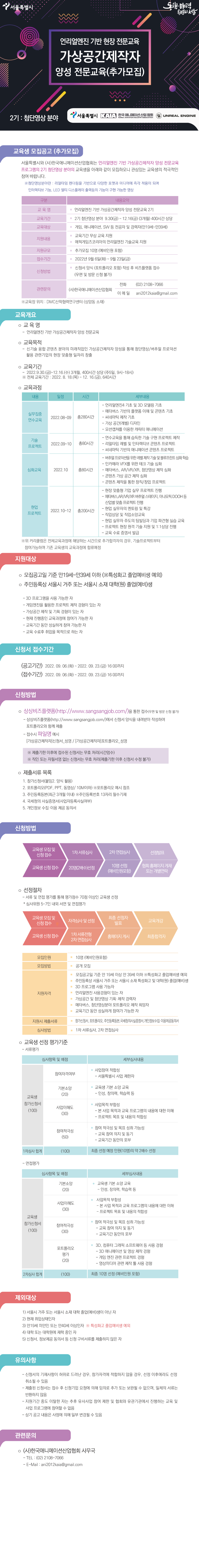 - 서울특별시와 (사)한국애니메이션산업협회는 언리얼엔진 기반 가상공간제작자 양성 전문교육 프로그램의 2기 첨단영상 분야의 교육생을 아래와 같이 추가모집하오니 관심있는 교육생의 적극적인 참여 바랍니다.