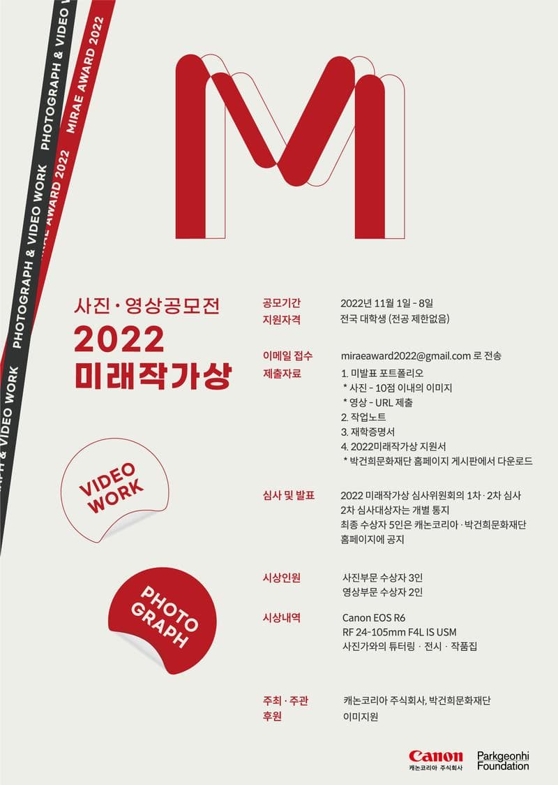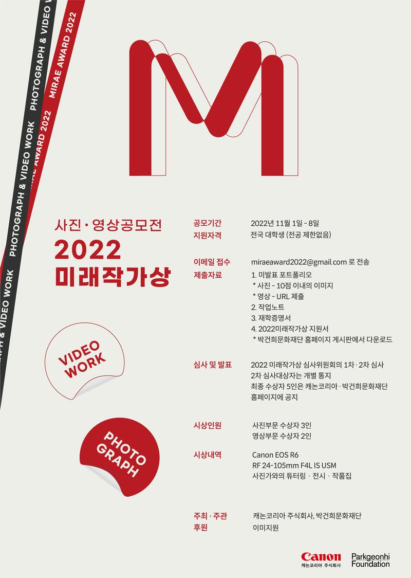 사진으로 꿈꾸는 모든 대학생의 열린 희망 미래작가상은 올해 11월, 전국 대학생을 대상으로 사진·영상부문을 공모합니다. 공모전을 통해 선정된 5인의 수상자들은 캐논 카메라를 제공받아 사진가와의 1:1 튜터링과 오형근 사진가와의 마스터 튜터링을 통해 성장한 작업을 2023년에 전시와 작품집으로 발표합니다.