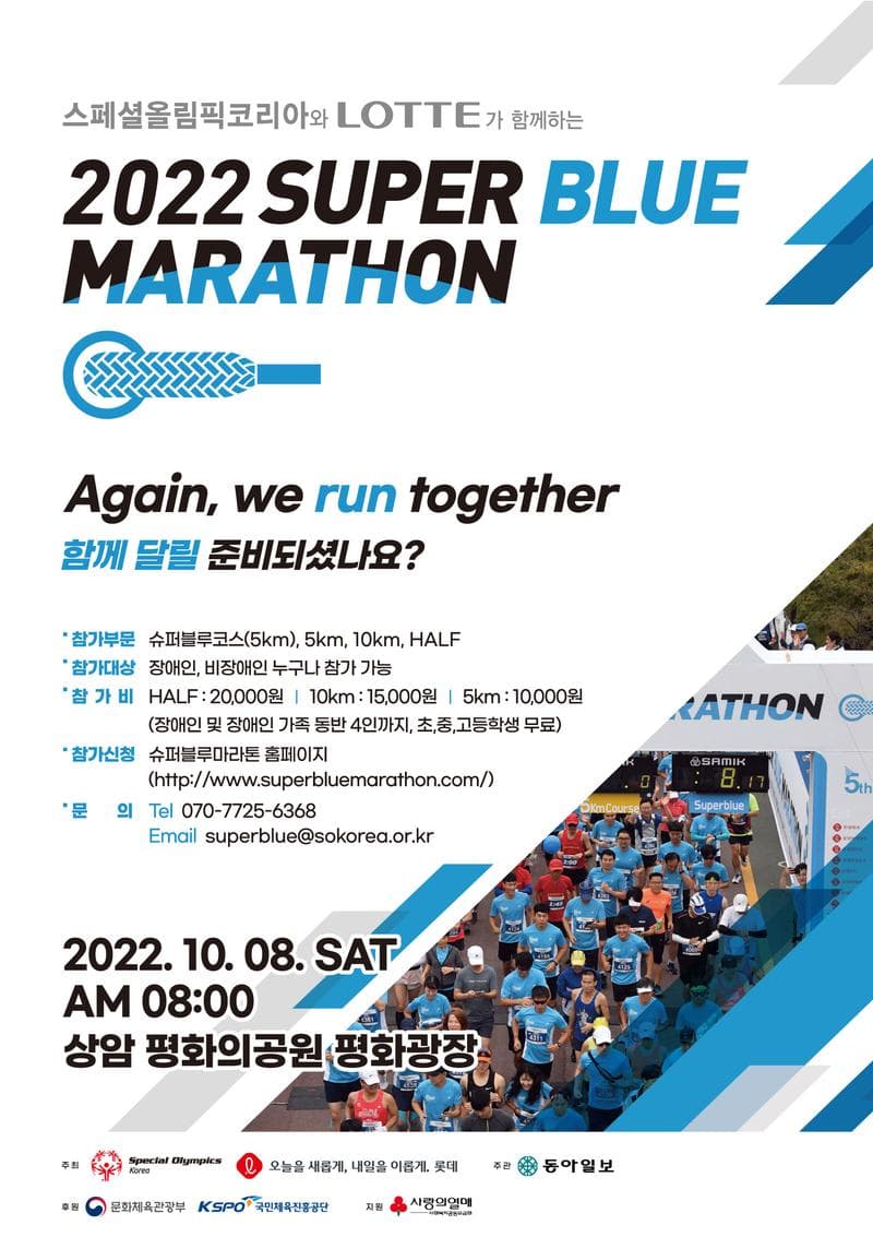 스페셜올림픽코리아와 롯데가 주최하고, 장애인과 비장애인이 함께하는『2022 슈퍼블루마라톤』대회가 아래와 같은 일정으로 ‘서울 상암 평화의공원 평화광장’에서 개최됩니다.