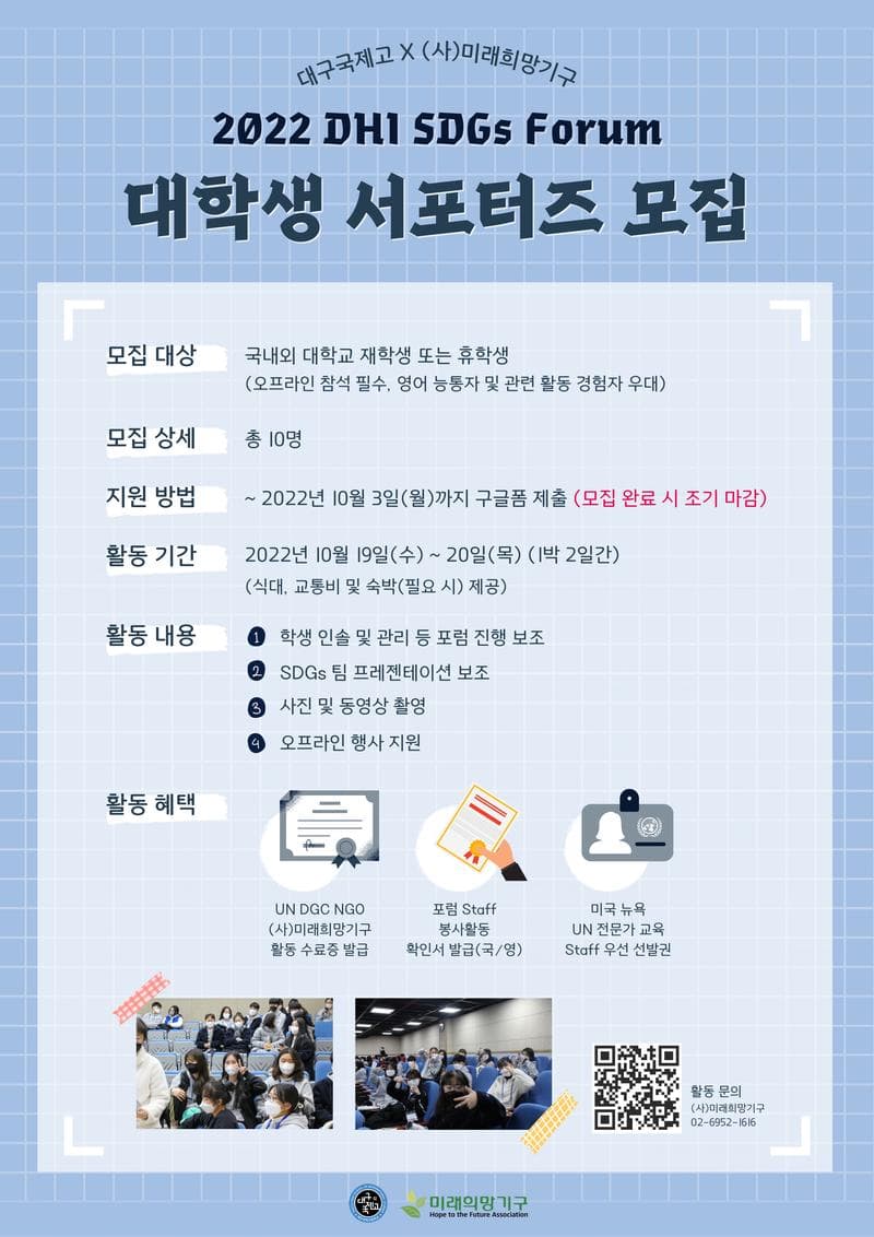 '2022 DHI SDGs Forum'은 외교부 소관의 국제 NGO (사)미래희망기구와 대구국제고등학교가 함께 진행하는 교내 컨퍼런스로,