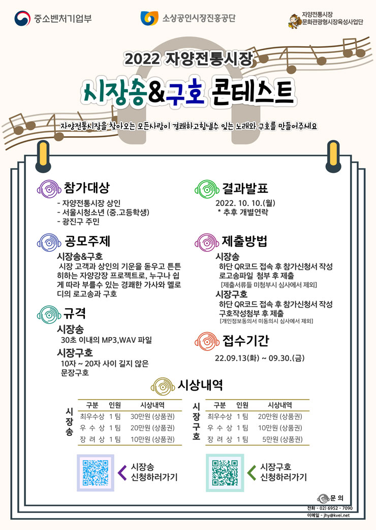 - 시장송 : 포스터 내 QR코드 접속 후 참가신청서 작성\, 로고 송 파일 첨부 후 제출
