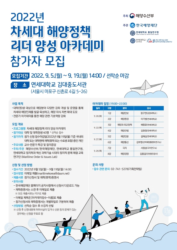 - 주최/주관 : 해양수산부/한국해양재단, 연세대학교 통일연구원, 연세대학교 정치학과 혁신 과학기술 시대의 정치적 문제 해결 교육연구단(Maritime Order & Issues Lab)
