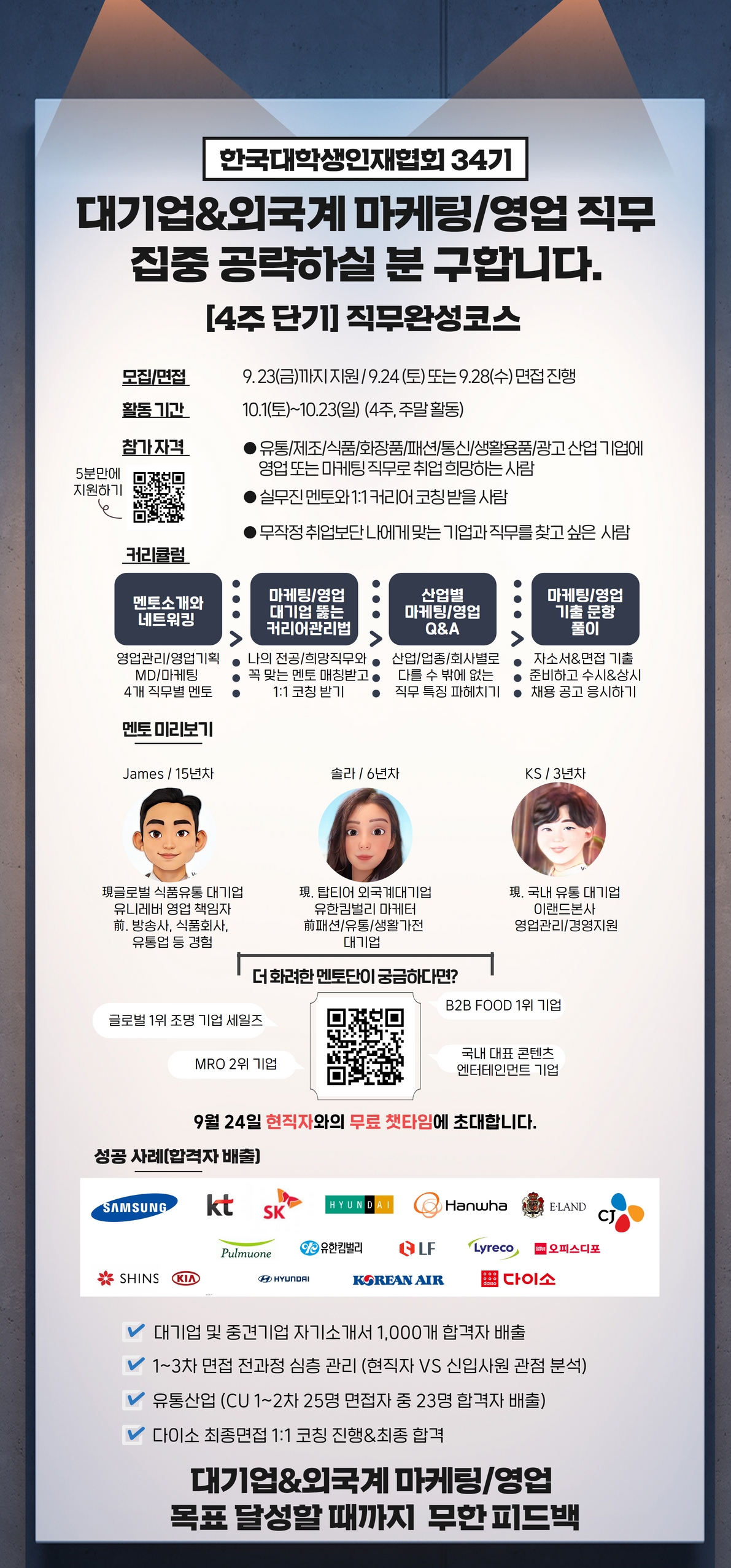 다양한 업종&직무의 실무진과 취업 트렌드를 배우고, 실전 취업 준비를 함께할 서울/경기도 소재 대학생 및 취준생