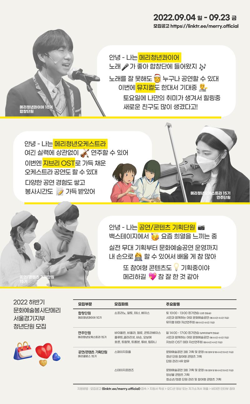2022 하반기 📣 문화예술봉사단메리와 함께할 재능 있는 청년대학생 단원을 공개 모집합니다.