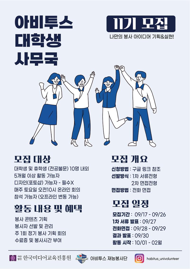 1) 정기 온라인 봉사 기획 (단기): 아비투스 재능봉사단은 학생들의 봉사활동에 도움을 주고자 정기적으로 봉사할 수 있는 활동을 기획하고 실행 운영하는 봉사활동 기획팀(11기)을 모집합니다. 과거 아비투스 봉사단의 대표적인 활동에는 ‘함께 도전하는 플로깅’, ‘한국문화 한 바퀴’, ‘꿈사다리 멘토링’ 등이 있으며, 더욱 많은 활동과 결과물은 @habitus_volunteer 인스타그램 계정에서 확인하실 수 있습니다.